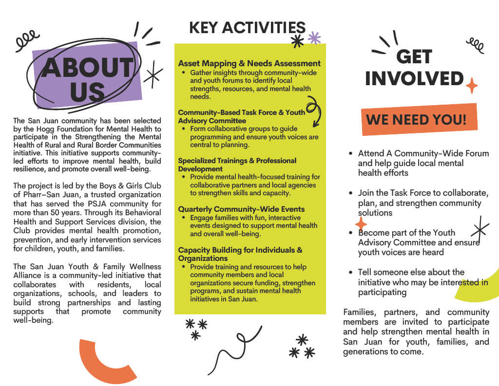 The Boys & Girls Club of PharrβSan Juan will serve as the lead organization for the San Juan collaborative. With over 50 years of service in the PSJA community, the Club brings extensive experience in promoting mental health, preventing challenges, and providing early intervention services for children, youth, and families.
