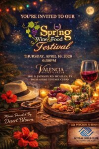 This event is a great opportunity to enjoy delicious local foods, a variety of diverse wines, live music and more all in support of the youth, teens and families of the Boys & Girls Club of Pharr – San Juan!